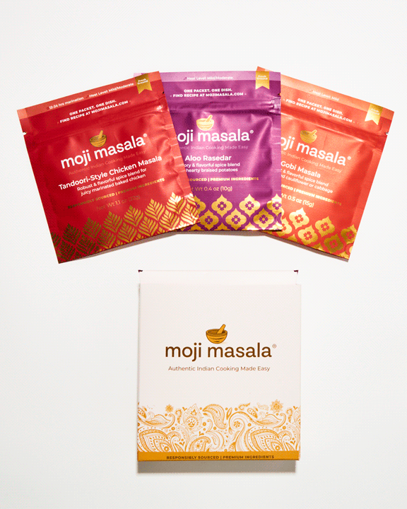 Make your own gift set using Moji's beautifully designed 5x5 gift box. The boxes are perfect as stocking stuffers or for corporate giving. Each box holds up to 4 meat and fish packets and up to 6 vegetarian packets. For larger orders, feel free to email us at info@mojimasala.com and we will be happy to put together a custom order for you.